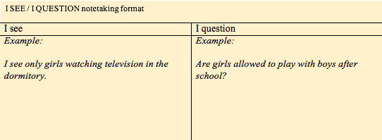 For the first activity, I taught students to investigate actively the school culture in Aceh by using a basic two-column “I see/I question” ethnographic notetaking style while observing a photo slideshow about the Acehnese school. We use this notetaking tool at FACTS when teaching folk arts education inquiry skills. Since our Acehnese friends all attend boarding school, these initial photos helped the students generate questions so they could understand more details about their friends’ daily lives. It was also clear that the students were comparing their friends’ school with their school experience, thereby enriching their understanding of their own school culture. For example, after seeing a picture of a group of girls watching TV together at the dormitory, one student asked, “Do girls have different classes than boys? Can they talk to boys?” After seeing a picture of a large, open-air cafeteria, students asked, “Why do they have a better school than us?