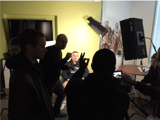 Following an interview, Barron Gulak views footage as cinematographer Patrick Harris and interviewer Maggie Kopp look on.