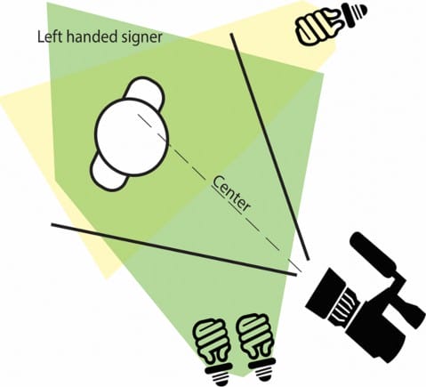 In ASL the dominant hand is the one used to fingerspell. This hand also does more of the movement for many signs. Lighting the dominant hand more prevents shadows from impeding readability. There is more than one way to do this, but use the image below as a guide. Notice that the person is not sitting in the middle of the camera shot, but slightly off to the side. Shoulders are at an angle to the camera. More light is shining onto the hand that fingerspells words. Slightly more space is on the side of the dominant hand. This format gives the interviewee room for large signs that extend past the body. It also creates a more interesting visual image than sitting precisely in the middle of the screen with shoulders square to the camera.
