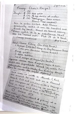 The back page of a zine made by undergraduate student Davis Yewell featuring his grandmother’s pierogi recipe. Reflecting on his intentions for creating this zine Yewell wrote, “I included some specific family recipes on the back to both provide a starting point for those wishing to make their own, and to reiterate the hereditary and familial aspects of the pierogi making tradition.”
