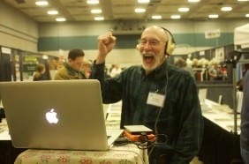 Farmer Bob Henson, of Henson Family Farm in Clinton County, Ohio, cheers during a viewing of a prototype Growing Right multimedia piece featuring many of his friends and fellow early Ohio organic farmers during Growing Right’s pop-up exhibit at the trade show hall at OEFFA’s 2017 Annual Conference in Dayton.