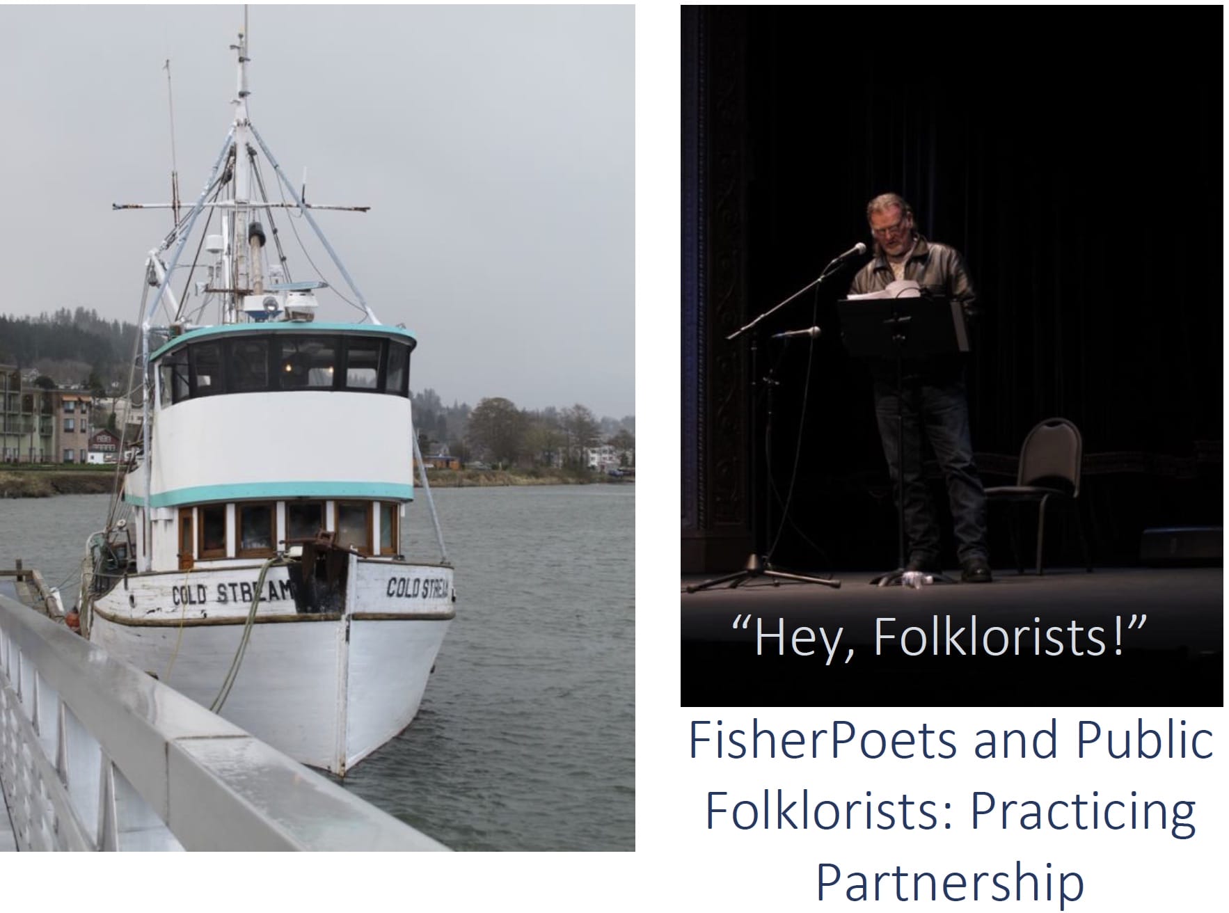 One of the main reasons I was drawn to folklore, as an undergraduate and then as a career choice, had to do with my love for hearing stories, whether they are folk tales, oral histories, or personal experience narratives. My first folklore fieldwork was with watermen on the Chesapeake Bay in 1975. I was an undergraduate in a folklore and fieldwork class that folklorist Bob Bethke and historian Jim Curtis, University of Delaware faculty, were team teaching. I marvel now at their courage in first mentoring then setting loose a group of college students to document the stories of working watermen. In 2012, after over three and a half decades of folklore practice across the U.S. and the U.K., I started a new job at the Oregon Folklife Network (OFN), the state’s designated folk and traditional arts program. I was looking forward to hearing new stories in new places. Jens Lund, then the folklorist for Washington State Parks, had told me about the FisherPoets Gathering some years before; once he knew I’d be taking the OFN position, he urged me to attend the 2013 Gathering. He introduced me to FPG organizers Jon Broderick (commercial fisherman, retired high school English teacher, fisherpoet and singer/songwriter) and Hobe Kytr (marine historian and singer/songwriter).