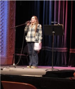 Moe Bowstern at the Liberty Theater, Astoria, Oregon. Photo by Riki Saltzman, courtesy of the Oregon Folklife Network.