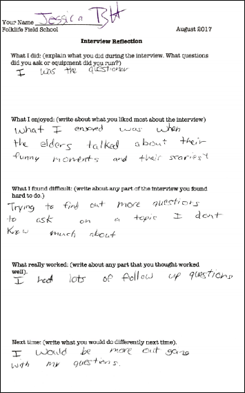 DS: When we first started, you [OFN] had some equipment, and we [at Culture and Heritage Archives] had some archiving auditory equipment we used to show the kids how to preserve stuff…. We had a desktop recorder, pen recorders, disk recorder, cassette tape recorder, even dual cassettes, and some of the kids made iPhone recordings, born digital. They enjoyed learning the different techniques and equipment used to gather the materials. Some of them had iPhones and had [their interviews] done before they arrived at the Archives for the fieldtrip. Even those ones took notes, recorded, and used what they learned on their tour of Culture and Heritage.
