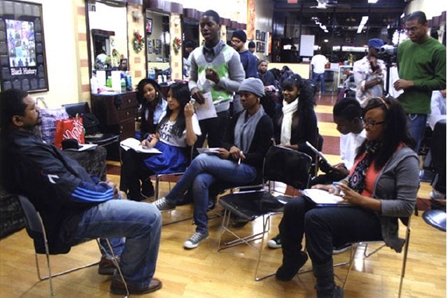 Participants in the Dr. Beverly J. Robinson Community Folk Culture Internship Program at Mind-‐Builders Creative Arts Center in the Bronx, New York, interview master barber Dennis “Denny Moe” Mitchell about his two decades of experience. Photo by Jade D. Banks