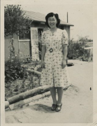 Masako in front of her Granada, Colorado, concentration camp barracks, 1944.