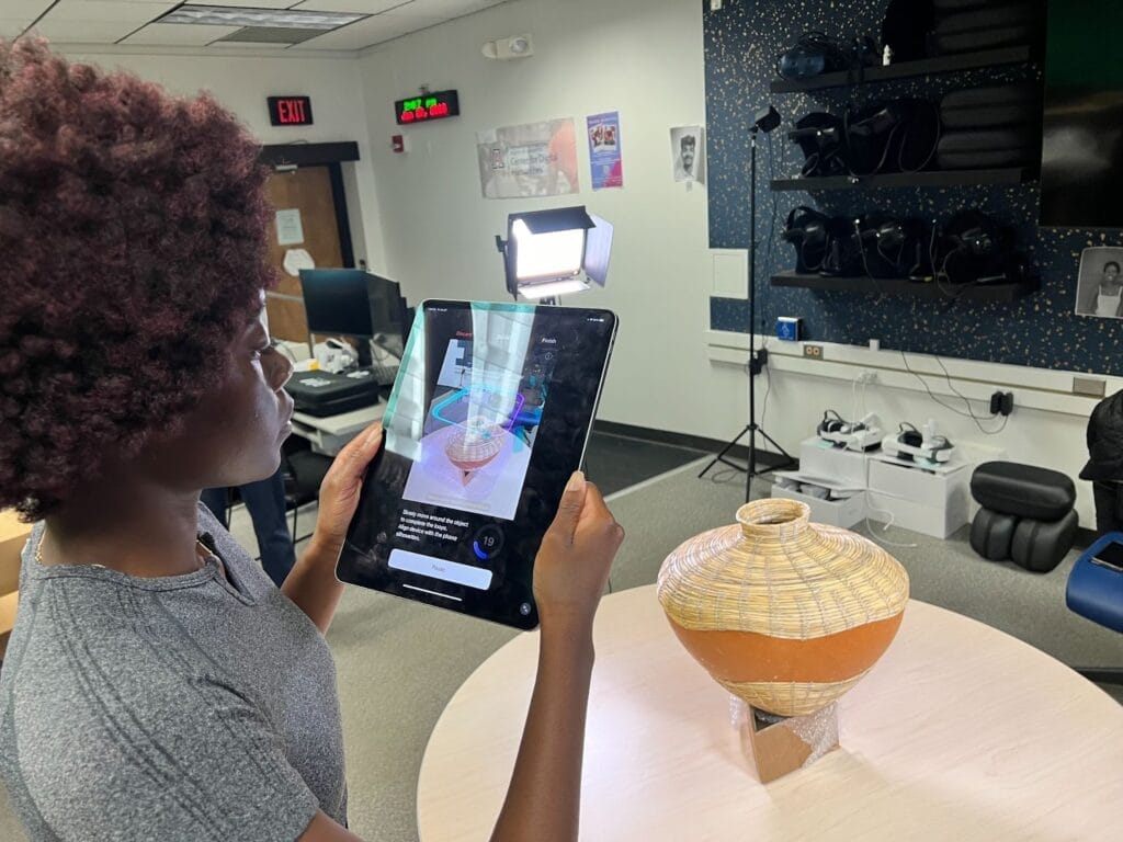 University of Arizona student Amelia Matheson 3D scanning a basket by Terrol Dew Johnson for inclusion in ASM’s AR experience. Photo by Lisa Falk.