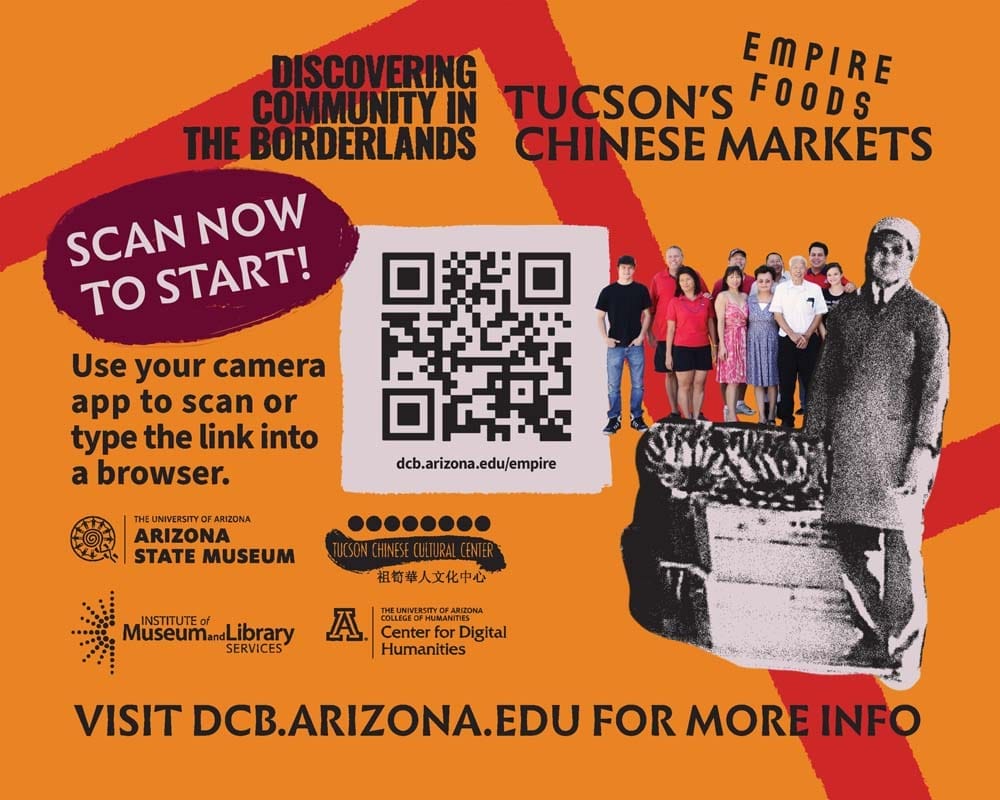 AR sign for Empire Market, one of the few remaining Chinese markets in Tucson. Originally it was Joe Tang’s Market, established in the 1930s. The sign triggers a video that includes historic photographs and interviews with the current owner and community members for whom the store played a part in their lives.