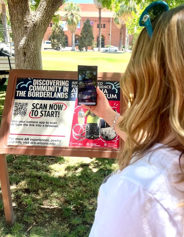 Use your phone to scan the QR code for a taste of the Discovering Community in the Borderlands AR experiences. In this teaser, you are greeted by Marc Pinate as a hologram. He tells you about the AR exhibits and shows examples of 3D objects and 2D photographs and a map of the sites while encouraging you to go to the DCB website to get directions and learn more. The AR experience signs are dispersed across Tucson and accessible by scanning the QR code on them with your phone. You can also scan the QR codes on the DCB website. We use this introductory AR experience on postcards placed at libraries and given out by the partners, as well as on Tucson’s trolley car plaques and advertisements in local newspapers.