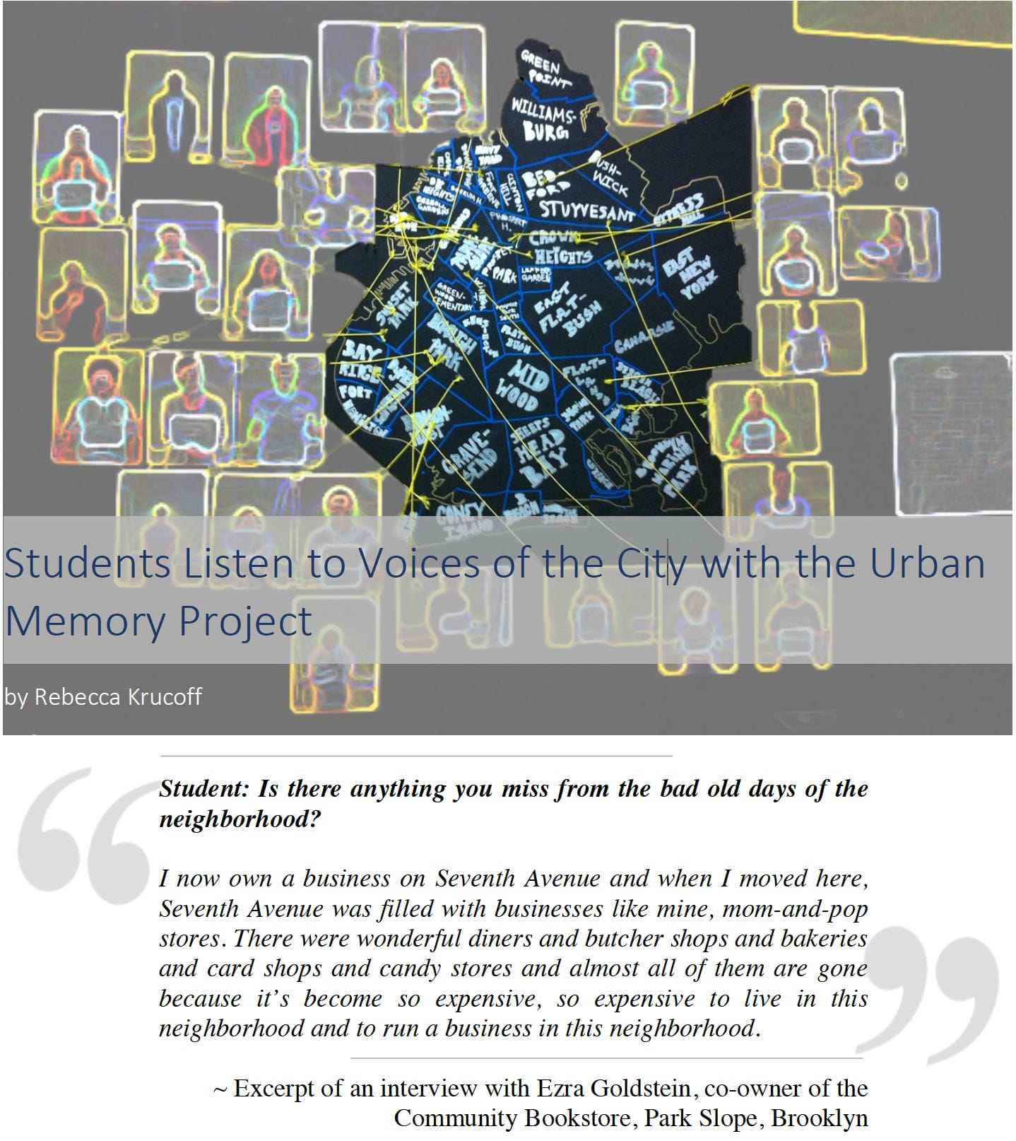 This article is indebted to the work of the amazing teachers and students of Park Slope Collegiate in Brooklyn, particularly Michael Salak, and Principal Jill Bloomberg, who has championed UMP since its founding. I am grateful as well to the numerous NYC residents who have volunteered their time and stories, allowing us a glimpse into their personal cities.