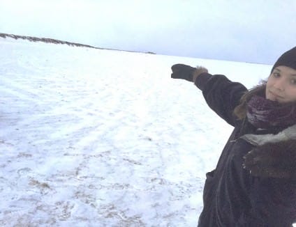 One year during this course, residents voted to change a North Slope village name from Barrow to its original place name Utqiaġvik. Elders expressed a concern about community members getting lost and perishing. One solution they suggested is to emphasize teaching significant landmarks that have place names. In Figure 1, Celina Swerdfeger points to an old trading post built long before Western contact where Iñupiat would gather to trade, dance, and tell stories.