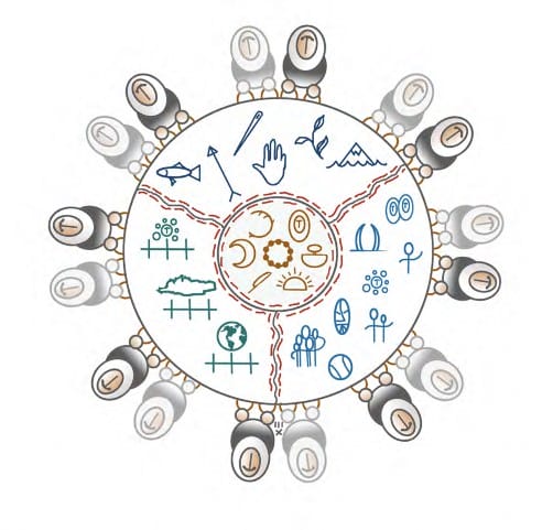 In 2010, NSBSD adopted an Iñupiaq Learning Framework (ILF) called “Mapkuqput Iñuuniaġniġmi—Our Blanket of Life” (see Figure 2).3 Local educators and community members in the school district developed this framework and continue to add lessons and Iñupiaq assessments to meet cultural and academic rigor for their children. This Iñupiaq framework identifies knowledge and skills needed to be taught in their Iñupiaq curriculum based on Iñupiaq cultural values. They put each skill into four realms: Individual Realm, Community Realm, Environmental Realm, and Historical Realm. Each is tied and connected together with sinew, representing the Iñupiaq language and spirituality. The symbols on the blanket represent the North Slope Iñupiaq Cultural Values.