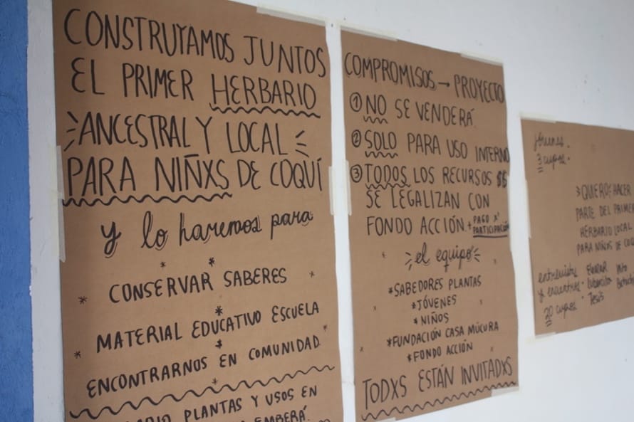 In Casa Múcura’s School of Ancestral Knowledge, 35 elders (sabedores) and 15 children from Afro-Colombian and Indigenous Emberá backgrounds worked together with a team of four Casa Múcura members using Participatory Action Research methodology (PAR) to create what the community called the Herbarium of Coquí. The participatory project lasted one and a half years, during which organizers and community members used different tools to document their traditional plant knowledge as part of the educational program of the School: storytelling, focus groups, community dialogues, and intergenerational workshops for the creation of a cyanotype herbarium.