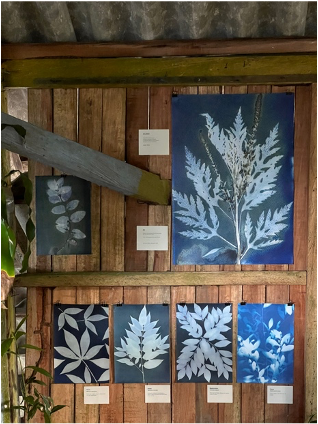 Relatively simple to learn, cheap, and non-toxic (as opposed to silver-based processes), cyanotype is usually taught as an introduction to the rudimentary bases of photographic technique (James 2016). Without delving into the chemical details, children of all ages can experiment with making prints of leaves, roots, branches, etc. and see concrete, palpable results in only minutes. Despite the difficulty of an environment with 100 percent humidity (and thanks to the intensity of the intermittent tropical sun) the participants in the workshop—children ages 2-12 and elders 40 and older—intuitively grasped the essence of cyanotype technique. It also proved to be a stimulating means to strengthen the elders’ lessons on the exuberant diversity of local medicinal and edible plants that they had been teaching the children in the School of Ancestral Knowledge. Children, elders, and the members of Casa Múcura’s team, in effect, collectively created a beautiful visual catalog—an Herbarium—of more than 50 medicinal plants. The images were then collated with the year-long participatory research surveying common and scientific names of species and detailing their medicinal uses and the methods to prepare and apply them. This comprehensive research was published online as part of the results of Fondo Acción’s grant.