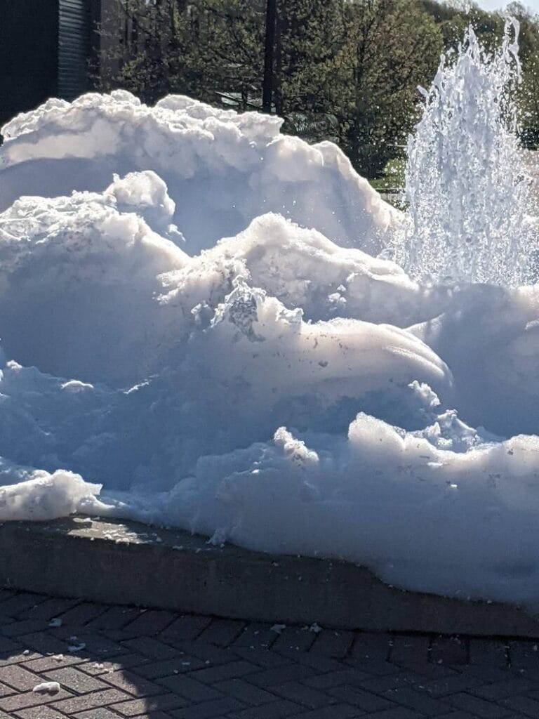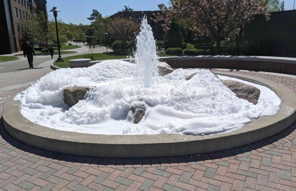 The soaped fountain: a symbol of a vibrant student culture at RIT, May 14, 2021. Photo Credit: u/Quarter_Adorable on r/rit.