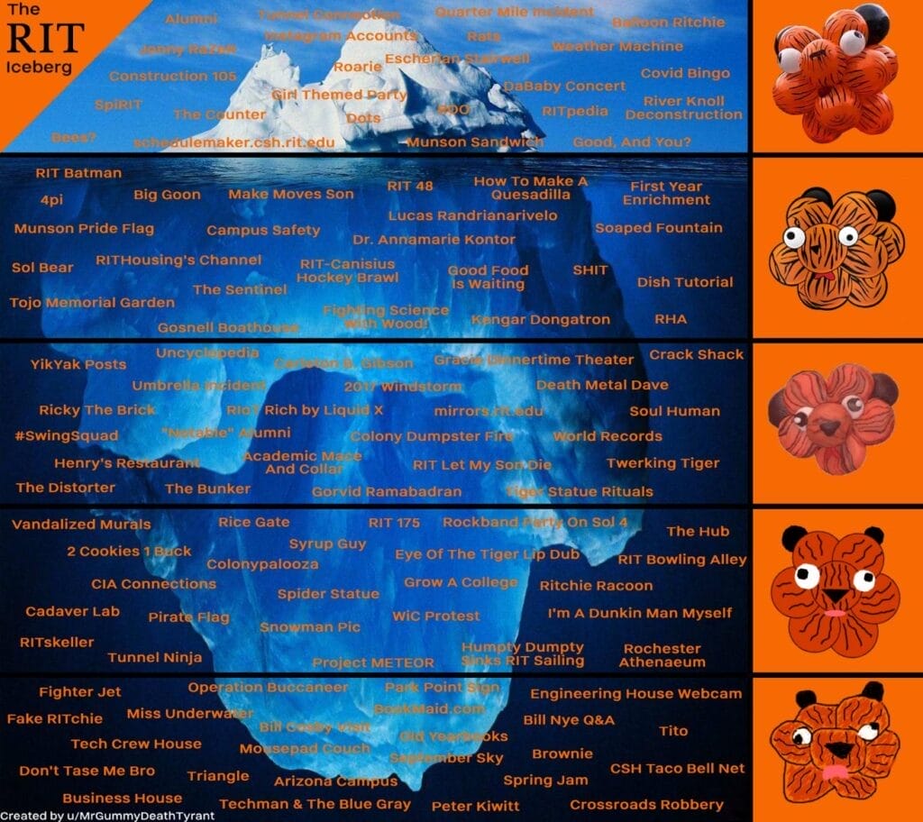 Version One of the RIT Iceberg, released to r/rit August 11, 2023. It features 120 entries of RIT folklore, history tidbits, and fun facts, https://www.reddit.com/r/rit/comments/15ocrfx/the_rit_iceberg.