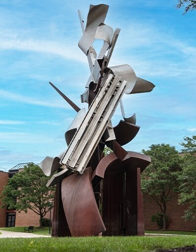 The Sentinel Statue by Albert Paley is said to give power to the RIT President to control the weather around RIT. It is colloquially known to students as the Weather Machine. Photo Credit: The RIT Sentinel Society.