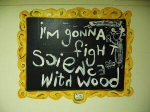 The I’m Going To Fight Science With Wood! tunnel mural, once a staple of RIT student culture, has since been painted over, and even finding surviving photos of it was a challenge. Photo Credit: Kim Slawson, from Facebook.
