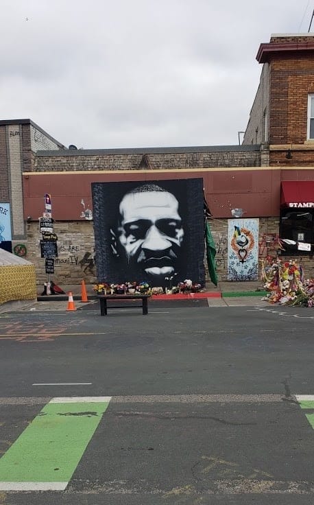 3 George Floyd Square is a spontaneous memorial honoring George Floyd at the intersection of 38th St. and Chicago Ave. in Minneapolis, the site where George Floyd was murdered. The intersection has been blocked off to traffic since people started to gather, bring offerings, and create art. Today George Floyd Square is a site of memorialization, community gathering, social justice and mutual aid work, artistic expression, and ongoing protest. Volunteers tend to the site daily, led by Jeanelle Austin, a native of Minneapolis who returned to her neighborhood to care for the site. For more, see Carlson, “Improbable Joy,” https://nationsmedia.org/improbable-joy-jeanelle-austin-speaks-out-about-george-floyd and Ajasa, “‘It’s for the People’: How George Floyd Square Became a Symbol of Resistance–And Healing,” https://www.theguardian.com/us-news/2021/mar/27/its-for-the-people-how-george-floyd-square-became-a-symbol-of-resistance-and-healing.