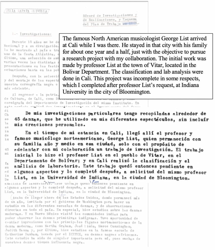 Translation: George List was not fluent in Spanish by the time he did his first fieldtrip, and he knew little about musical practices in the Colombian Caribbean. Delia Zapata Olivella, on the other hand, was native to the region and had spent several years researching different musical and dance traditions. Therefore, Delia Zapata Olivella acted as an interpreter for him, not only in terms of English-Caribbean Spanish but also in musical and cultural terms.